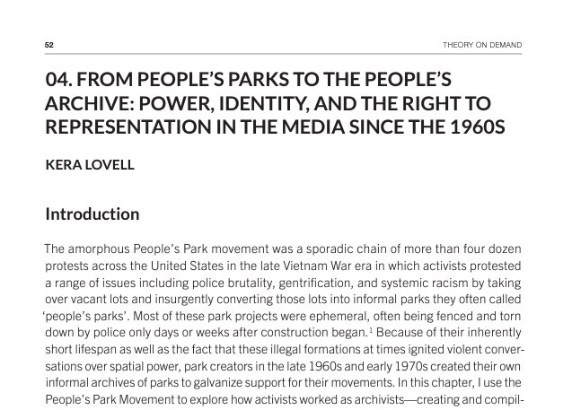 Lovell, K. “From People’s Parks to the People’s Archive: Power, Identity, and the Right to Representation in the Media, from the late Vietnam War era to the World Wide Web,” chapter in Archiving Activism in the Digital Age, eds. Daniele Salerno and Ann Rigney (Amsterdam, Institute of Network Cultures: 2024): https://bit.ly/3xgZyXL.